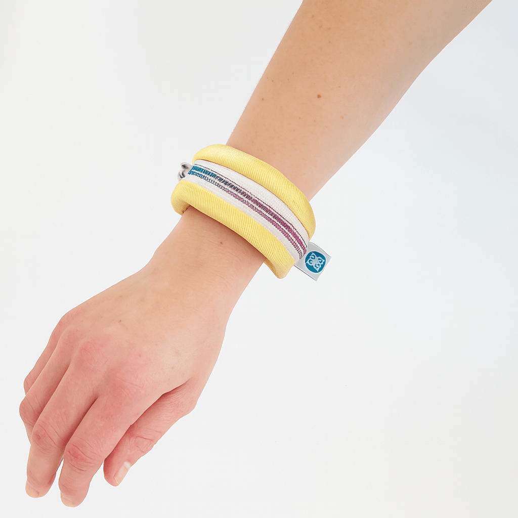 Bereit für eine colour explosion? Unsere Handgelenktasche haben wir aus farbigen Jeans gezaubert. Mit regenbogenfarbenem Reißverschluss und glitzerndem Gummiband, damit die gute Laune einfach nie verloren geht. Perfekt für Kleingeld oder Haargummis. Damit alles dabei ist, wenn der Eiswagen klingelt. Hier in der Farbe citrus.