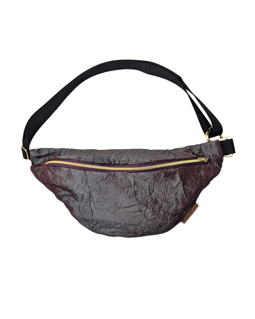 Die Hipbag hat ein Innenfach an der Vorderseite und ein Innenfach an der Rückseite, die mit einem Reißverschluss verschlossen wird. Mit einem Gurtband lässt sie sich einfach und unkompliziert in der Größe verstellen. Der Stoff ist burgund schillernd mit grünem Unterton.