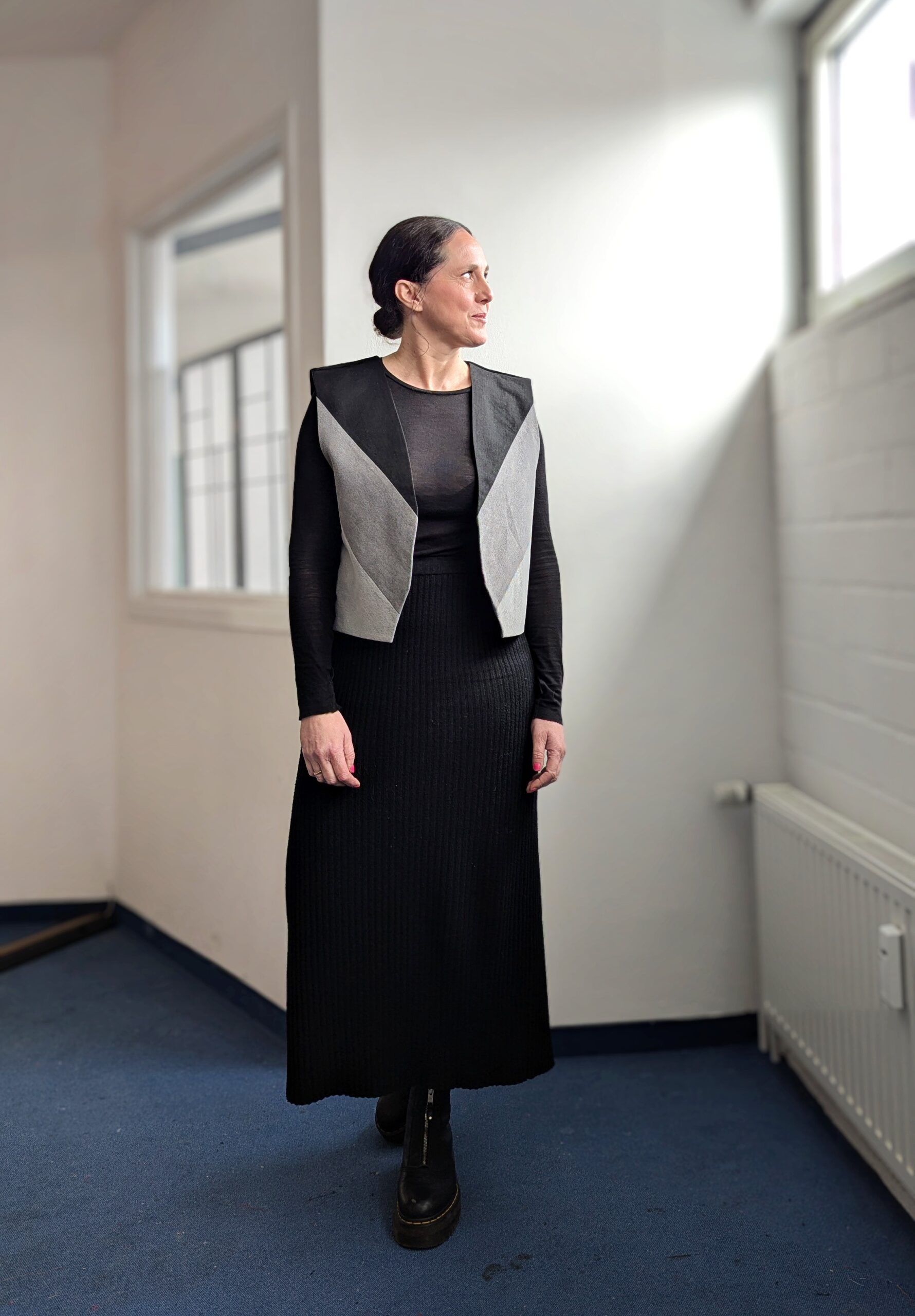 Unsere Weste wird aus pre-loved Denim und in den schönsten Grau- und Schwarztönen gefertigt. Das Design ist gradlinig und minimalistisch, mit überschnittenen Schulterpartien und edgy Kanten.